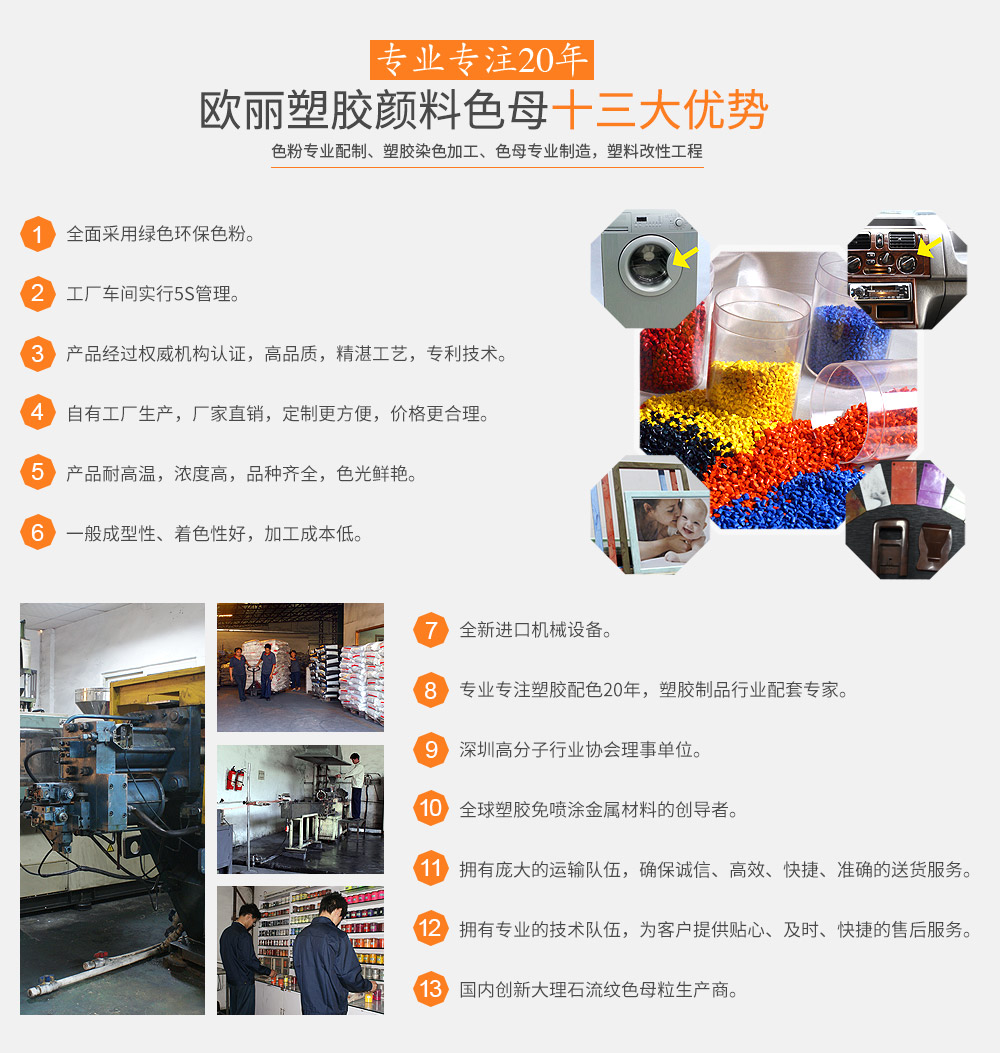 “深圳市歐麗塑膠原材料有限公司”創辦于上世紀90年代初,經過20多年的不斷發展壯大,已經成為色母粒、色母料、黑色母粒等塑料色母粒領先的色母粒廠家,更是塑膠制品行業的報務精英。
